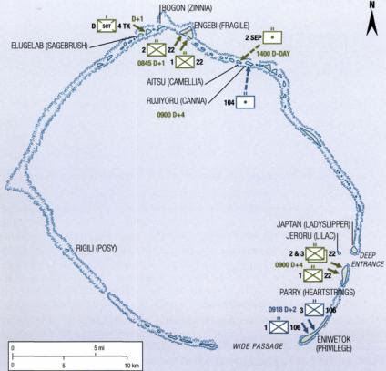 Eniwetok is a circular atoll, about 21 miles across. It is composed of 30 islets, on three of which the Japanese had established fortified defenses: Eniwetok proper (Privilege), which is on the atoll southeast rim; Engebi (Fragile), on the north rim, where the Japanese had built an airstrip in June 1943; and Parry (Heartstrings), which is two and half miles northeast of Eniwetok proper.